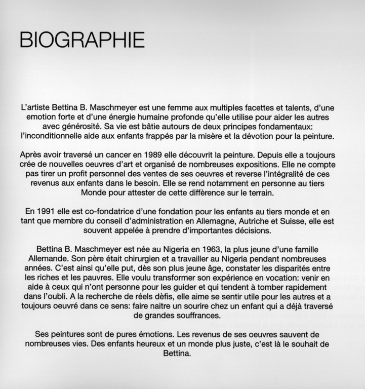 Notre Cabinet soutient la Fondation "Bettina for Kids" le temps de l'exposition des oeuvres de Bettina B. Maschmeyer jusqu'au 27 février 2015.